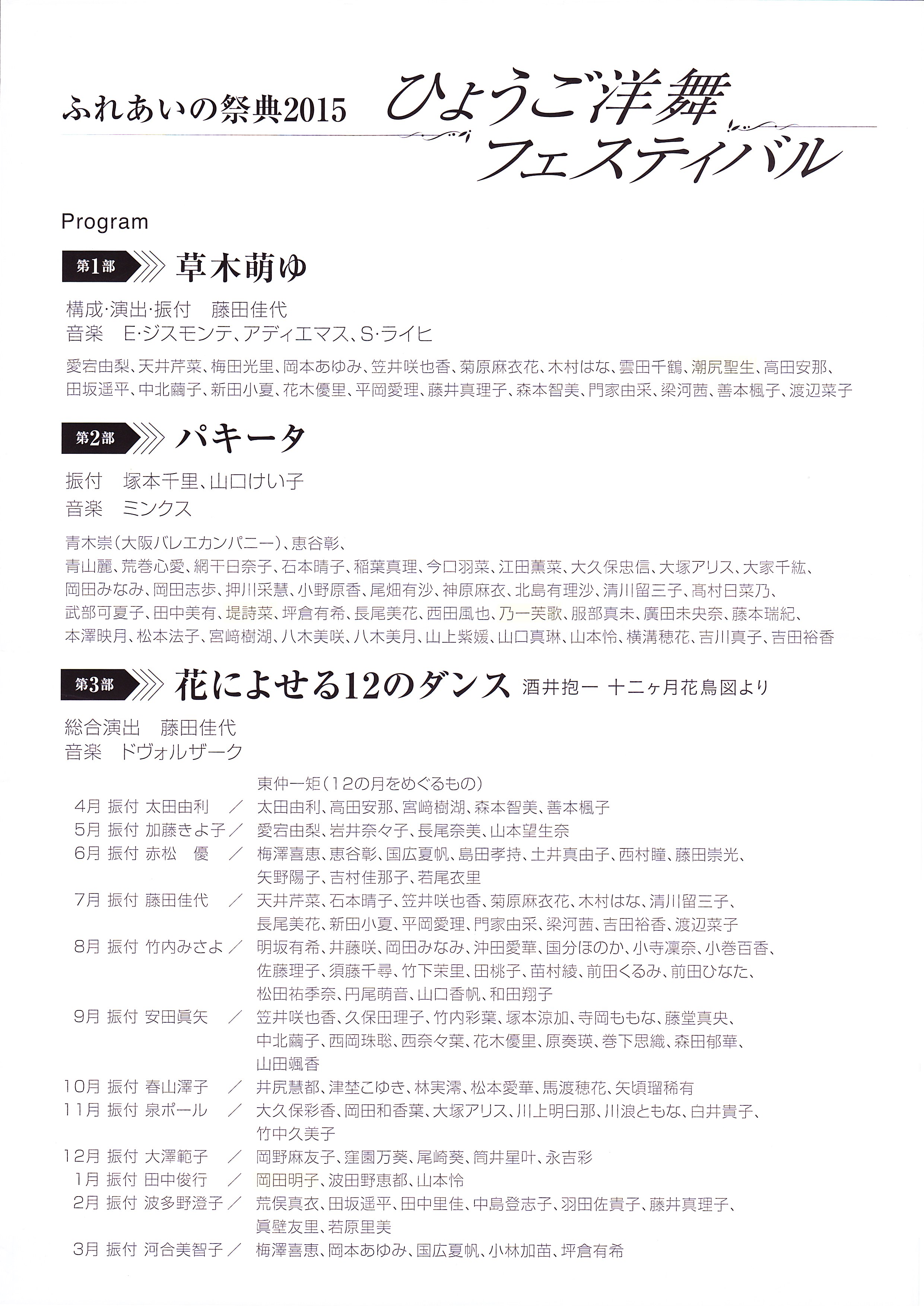 今回bjaccaからは3人の子供達が出演しています!第1部「草木萌ゆ」では阪神・淡路大震災を経て創られた作品の草役に出演。第2部「パキータ」ではポロネーズとマズルカに男の子役・女の子役のカップルで登場します。第3部「花によせる12のダンス」では江戸時代後期の絵師・酒井抱一の代表作「十二ヶ月花鳥図」をテーマに季節をめぐるダンスが繰り広げられます。私は一月「梅椿に鶯」の中に出演させていただいています。昨年亡くなられました蔵本誠子先生に追悼の意を込めて、舞台に立たせていただきたいと思います。
